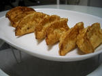 お芋はおいしいのですが、餃子もおいしい。 じゃあ、サツマイモと餃子がコラボレーションしたらおいしいのではないか。 そう思いついたので試してみました。 スイートポテト風揚げ餃子。 今回作った方法です↓ 1.サツマイモを焼き芋にします。洗ったサツマイモを拭いて電子レンジ600Wで3分程度そしてオーブン220℃で17分程度でしょうか。細かいところは様子を見ながら調節です。 2.サツマイモの皮を剥き、バター、メイプルシロップ、シナモンを加えて混ぜる。量は適当です。お好みで加減してください。バターはマーガリンやファットスプレッドでも代用可能です。今回はファットスプレッドを使用しました。メイプルシロップは他の蜜でも代用できると思います。今回はメイプル「風」シロップを使用しました。 3.できた餡を餃子の皮に包む。 4.170℃くらいの油で揚げる。 これでできあがりです。 案外簡単にできます。 揚げたてはめちゃ(゚д゚)ウマーです。 サクサクで、アマーイです。 ちなみに断面はこんな感じです。 冷めてしまったら、オーブンで焼くと復活します。 前回のチョコバナナ餃子やマシュマロ餃子よりもおいしいと思われます。 ※ちなみに、「焼き」よりも「揚げ」の方が美味しいようです。