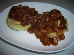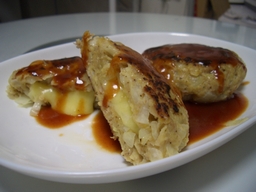 タマネギハンバーグ。 作り方は… タマネギを上下半分に切ります。 切ったタマネギの片方は、外側の2層を残してくりぬきます。 押すとポッコリ取れます。 もう半分の方はみじん切りにして、豚ミンチ、卵、パン粉、塩コショウと混ぜでこねます。 こねたやつはくりぬいたタマネギに入れます。 タマネギが器のようになるわけですが、タマネギの方には小麦粉を振っておきます。 こねたやつをくりぬいたタマネギに入れて、余った分は、そのまま丸めて普通のハンバーグにします。 次は焼きます。 タマネギに詰めた方は、詰めた方(肉の面)から焼いていきます。 もう片面も焼き、少し水を加え、5分程度蒸し焼きにします。 これでハンバーグは一応できます。 次にソースを作ります。 先程くりぬいたタマネギの中身をすりおろします。 皮がめくれて非常にやりづらいです。 最後はすりおろせなかった部分が大量に出たので、みじん切りにしました。 ついでにニンニクもおろして混ぜます。 これを、先程ハンバーグを焼いたフライパンで炒めます。 そこに、ケチャップ、ソース(テレビでは中濃を使っていましたが、今回はウスターと豚カツソースを混ぜました)、酒、醤油少しを加えます。 ちゃちゃっと炒めて、ソースのできあがり。 これを先程作ったハンバーグにかけて完成です。 奥の方がタマネギハンバーグ、手前がノーマルハンバーグです。 なかなか(゚д゚)ウマーだったのですが… タマネギを器にする意味がイマイチよくわからない… というのも、食べにくかったです。 途中で肉とタマネギの器が分離するし。 ナイフで切ってから食べるものなんですかねぇ。 タマネギの器に詰めるかどうかは別にして、ハンバーグは意外にすぐ作れるのでまたやろうと思いました。