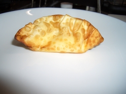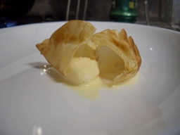 ご想像の通り、皮の中にアイスクリームが入った揚げ餃子です。 作り方は以下の通り 1.アイスクリームを餃子の皮につつみます。 このとき、しっかりと皮を閉じるように気をつけます。 2.アイスクリームをつつんだ餃子を冷凍で冷やします。 中のアイスクリームがしっかりと固まるようにします。 3.高温に熱した油で瞬時に揚げます。 4.できあがりです。 みためは普通の揚げ餃子ですが… 中身は バニラアイスクリームです。 皮は熱くてパリパリ、中はひんやりトロトロ。 絶妙です。 ちなみに今回のアイスクリーム餃子を作るにあたっては注意点が幾つかあります。 まず、皮はしっかりと閉じることです。そうしないと、中のアイスクリームが流出して焦げた塊になってしまいます。 次に、一度アイスクリームを包んだら、よく冷やすことです。中のアイスクリームがよく冷えていると、揚げたときに溶けにくくなります。 そして、油の温度を下げないことです。温度が低いと、皮が揚がるまでに時間がかかり、中のアイスクリームが溶けてしまいます。 少しずつ揚げるなどの工夫が必要だと思われます。 瞬時に揚げると皮が揚がり、中身が溶けていないアイスクリーム餃子ができます。 皮の揚がる時間とアイスクリームが溶ける時間の差を利用するわけですね。 食べるときは、できるだけ一口で食べたほうが良いです。 そうでないと、溶けた中身が流出してしまいます。 ぜひ一度試してみてはいかがでしょうか。 |